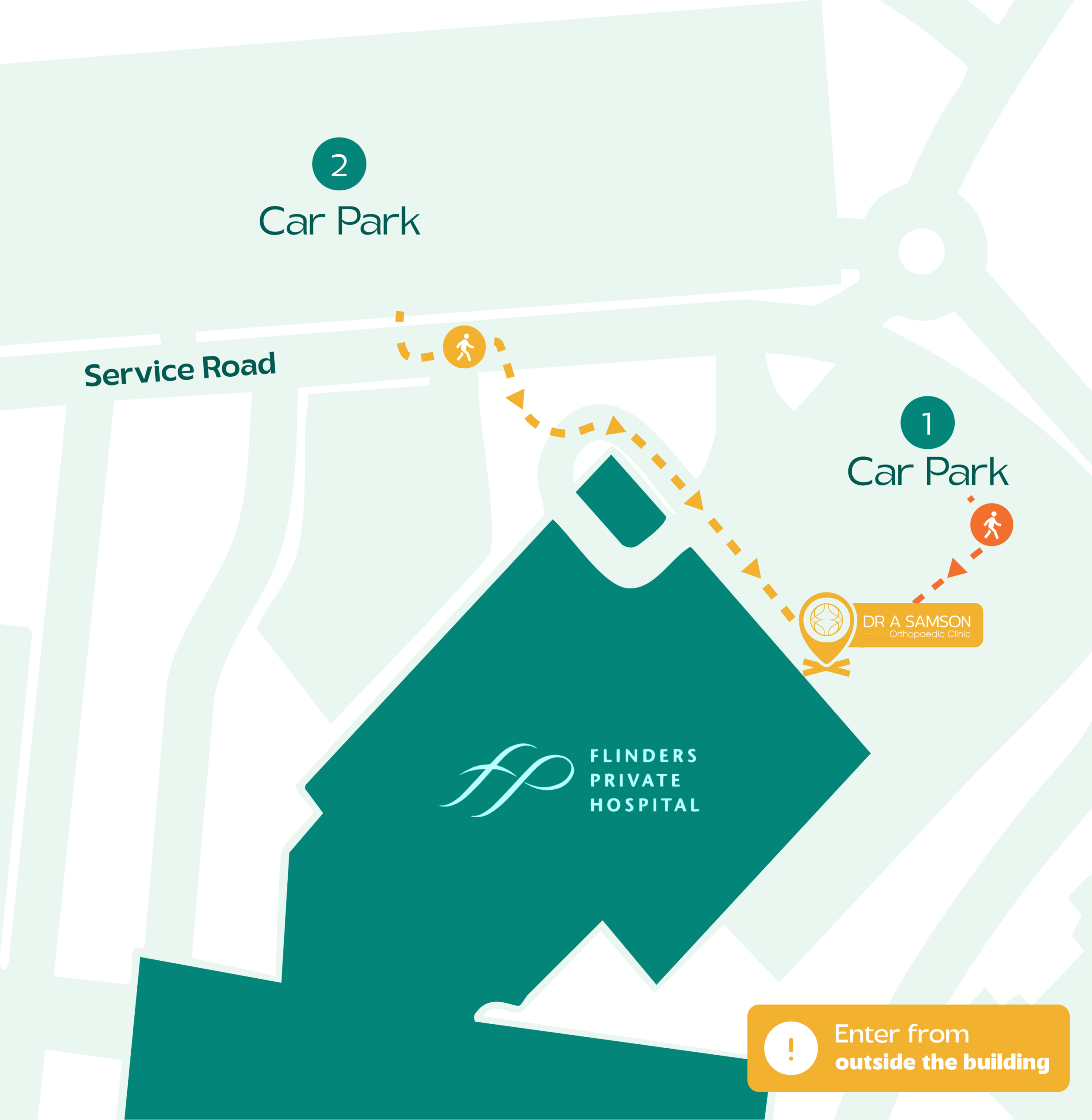 Location: Suite 204 is located outside the main entrance of Flinders Private Hospital. Turn left before the main hospital entrance and follow the footpath around the building. Walk past the parking pay machine and small ramp. The automatic door entrance to Suite 204 is approximately 30 metres along this path.